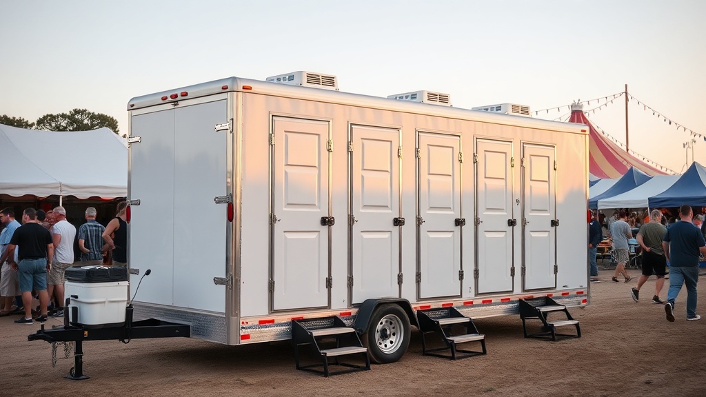 A portable restroom trailer is a mobile bathroom facility on a towable trailer chassis. Unlike single-unit porta potties, trailers contain multiple private stalls with flushing toilets, sinks with running water, mirrors, and climate control. They range from basic 2-stall units to luxury 10+ stall trailers for large events.